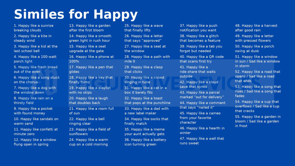 These similes map the feeling of Happiness with tight, image-rich comparisons, grouped for clarity: core lines, standout picks, light humor, fresh coinages, time-worn turns, and five paired bridges that place Happiness with Sadness, for contrast and quick choice in real talk and writing.
