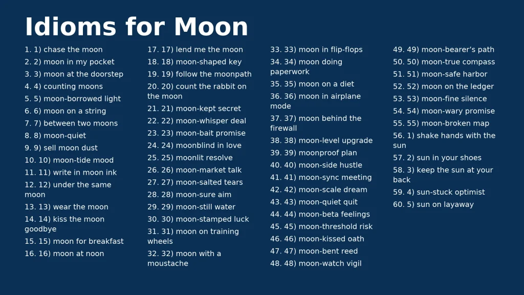I stack fresh, memorable idioms for “moon,” grouped for clarity. Each entry states meaning, a quick use case, a crisp example, and tight alternates. The flow moves from a broad set to highlighted picks, a light comic burst, a modern batch, classic tones, then a moon–sun pair-set for cross-context talk.