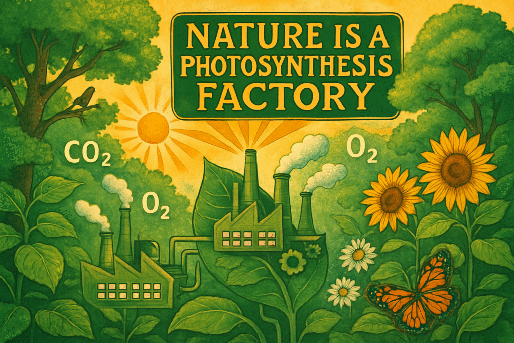 Example: Harvest thrives; nature is a photosynthesis factory.