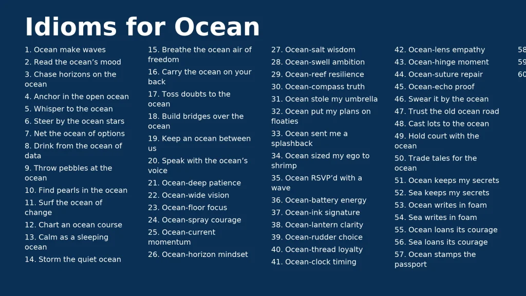 The list delivers 50 crisp idioms built on the entity “ocean,” each with meaning, a one-line example, and close lexical variants so writers swap phrases fast. Final lines lean into “standouts,” then pivot to a short “sea” companion set for internal relevance. Context stays tidal from surface waves to trench depths.