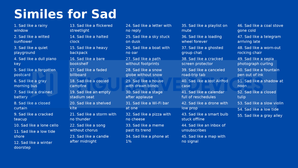 These 50 similes frame “Sad” in sharp, image-rich comparisons for quick meaning, fast recall, and clean use in speech or writing; each entry includes a tight meaning, a live example, and close-in alternatives that chain the mood forward into the next idea, ending with language that stays anchored to feeling.