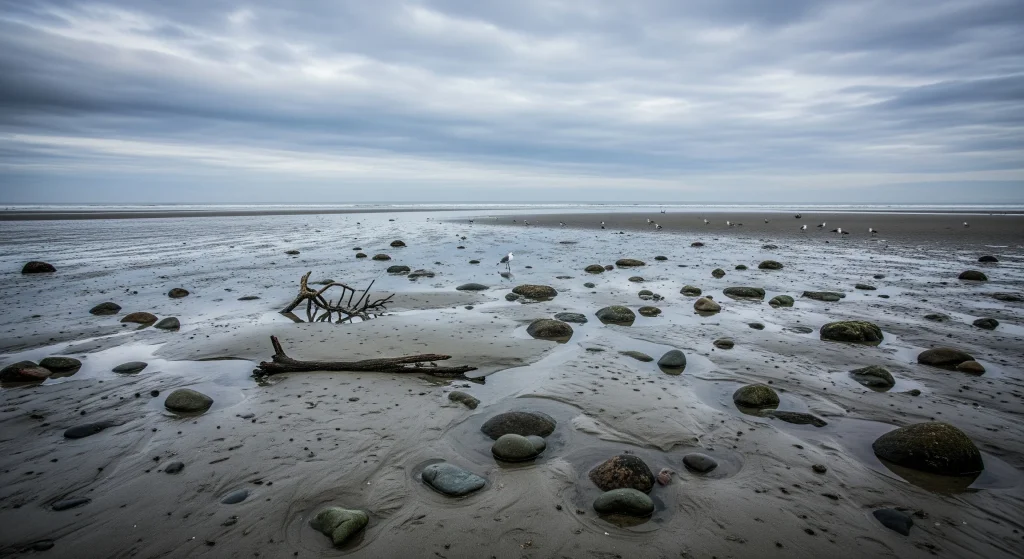 Other ways to say: ebbing, bare, receding, salt-bitten