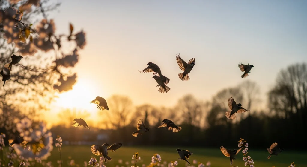 Example: At 9, we sync the sparrows; spring syncs the sparrows outside.