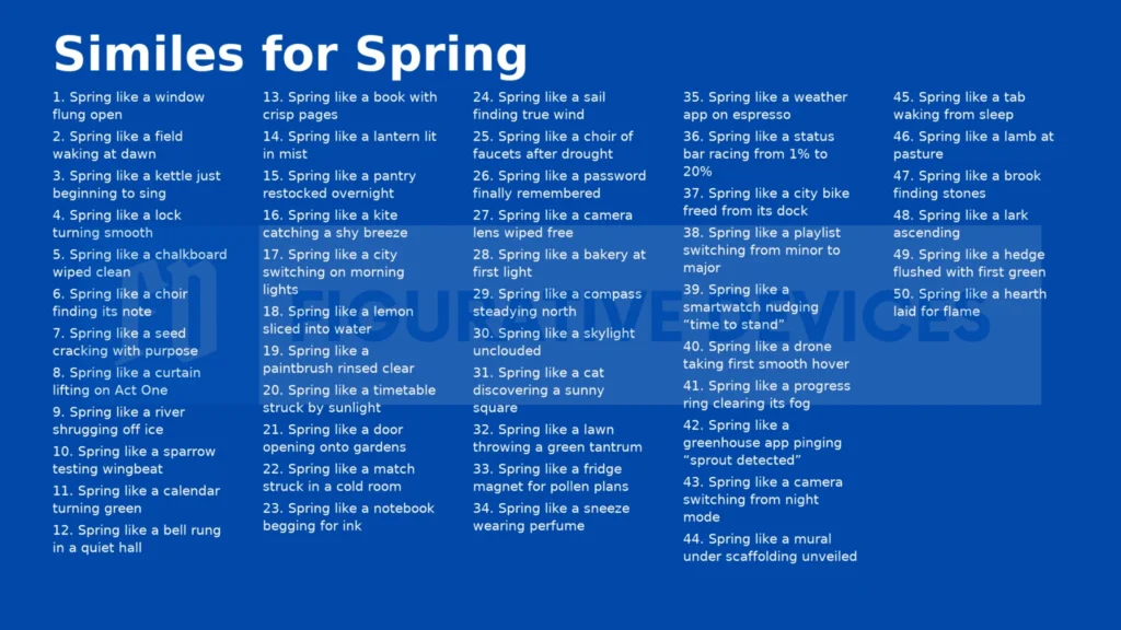 Fresh growth surges, colors brighten, and air softens. These 50 similes for spring group into core sets: everyday images, prime picks, playful turns, recent coinages, and timeworn echoes. The closing pairs align spring with autumn for balanced seasonal language.