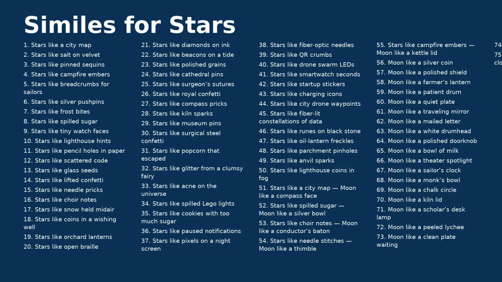These similes for stars focus on clarity, brevity, and strong lexical ties to night, light, and navigation. Sections progress from core sets to refined picks, playful tones, recent-feel images, heritage-flavored images, and a final bridge to moon-focused lines.